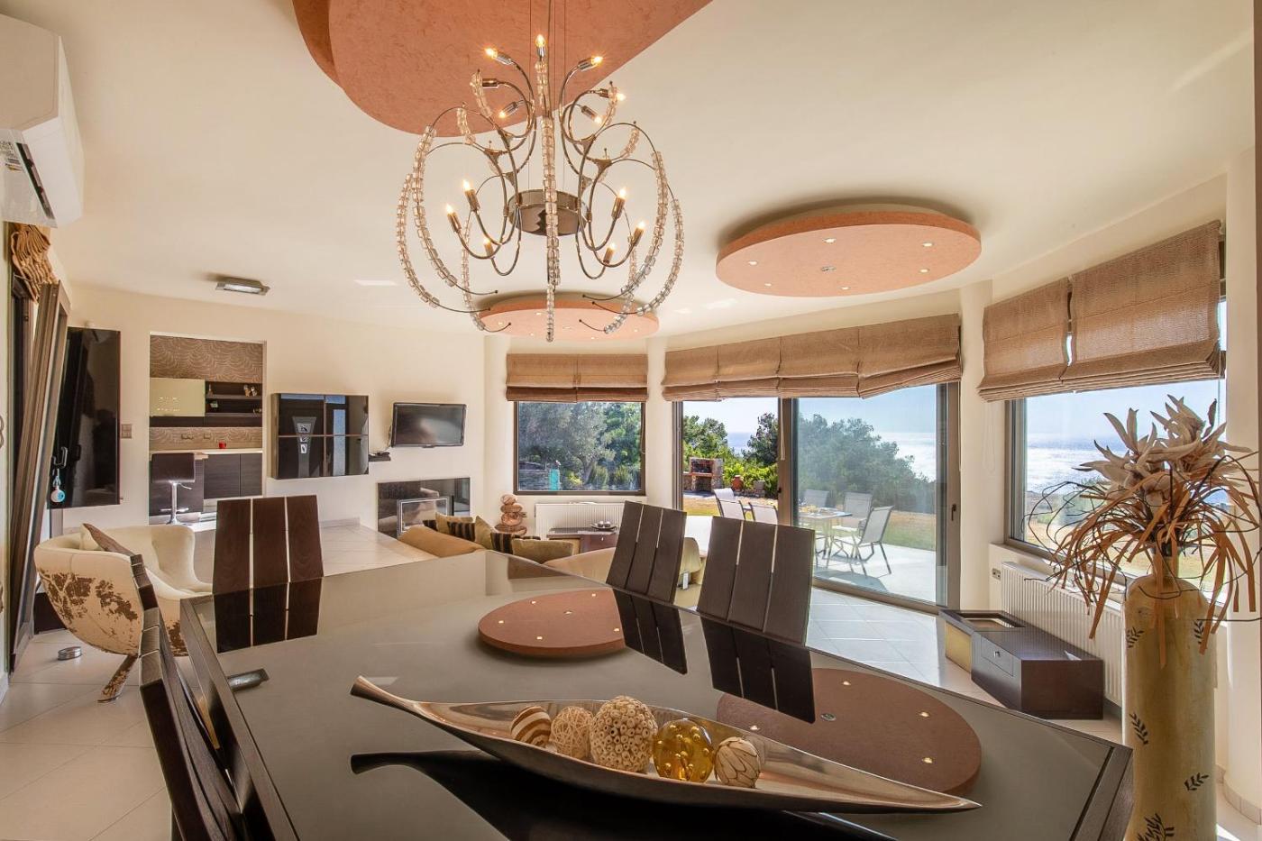 The villa is equipped with 2 bedrooms, 2 bathrooms, bed linen, towels, a flat-screen TV with satellite channels, a dining area, a fully equipped kitchen, and a terrace with sea views. The comfortable, air-conditioned accommodation also comes with soundproofing and a fireplace. The property has an outdoor dining area.